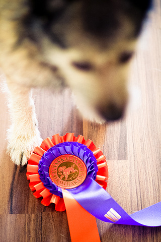 Lähes välittömästi oman vuoromme jälkeen Murun häntä laski koipien väliin ja koko koira alkoi läähättää ja täristä. Seuraavan kerran kun pilli vihelsi, tiesin mistä Murun kauhu kiikasti. Se pilli. Uusi tuomari puhalsi omaan pilliinsä niin antaumuksella, että Muru pelästyi silmittömästi koko ääntä. Kisattiin numerolla viisi, mikä osoittautuikin loppuenlopuksi hyväksi asiaksi: meitä ennen ei hyppyradalla ollut kuin pari koirakkoa, joten Muru ei ollut ehtinyt kuulla tuomarin pillin vihellystä ennen omaa vuoroaan. Loppuajan se tärisi kauhuissaan ja pyrki ovelle. Odoteltaessa palkintojen jakoa, yritin rentouttaa Murua (lue: survoin lihapullaa sen kitaan joka kerta, kun pilli vihelsi), mutta mikään ei auttanut. Se oli aivan kauhuissaan, kuin uutena vuotena rakettien paukkuessa. Hmh.