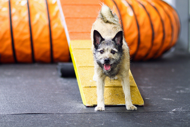Muru oli kisapaikalla vähän hermostuneen oloinen, mikä saattoi osaksi johtua omasta jännityksestäni, mutta epäilisin kuitenkin vieraalla hallilla ja suurella väkimäärällä olleen myös vaikutusta pienen koiran psyykkeeseen. Se mölisi jatkuvasti tuijottaen minuun kysyvästi. Lämmittelypaikalle oli koottu pieni estesarja, joka koostui kepeistä, parista hypystä ja A-esteestä. Otin Murun kanssa keppejä muutaman kerran huomatakseni, ettei se millään kyennyt tekemään kahta viimeistä väliä. En vieläkään tiedä mikä siihen oli iskenyt, sillä kepit olivat juuri se este, jonka luotin Murun osaavan. Vieraiden putkien olin aiempien kokemusten perusteella itse odottanut olevan Murulle radalla ehkä ongelma, mutta yllätyksekseni kepit koituivat meillä ihmettelyn aiheeksi. Lämmittelyn vuoksi hermoilin keppejä radalla, ja otin ne C-radalla varmuuden vuoksi koiran oikealta puolelta ohjattuna, vaikka tiesin, ettei se selvästikään ollut tarkoitus.
